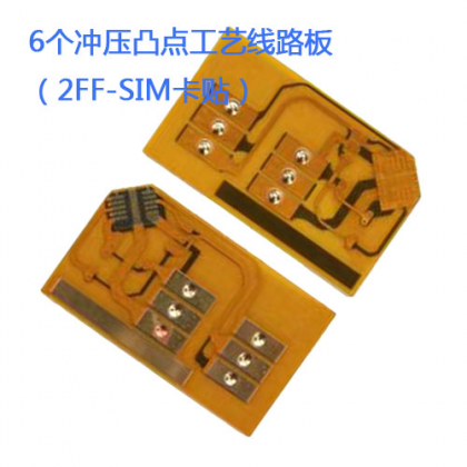 基于常規(guī)柔性線路板制造工藝,沉金表面工藝之上沖壓6個高度均勻,有一定抗壓強度的凸點,應用于2FF-SIM卡貼,可植入SI...